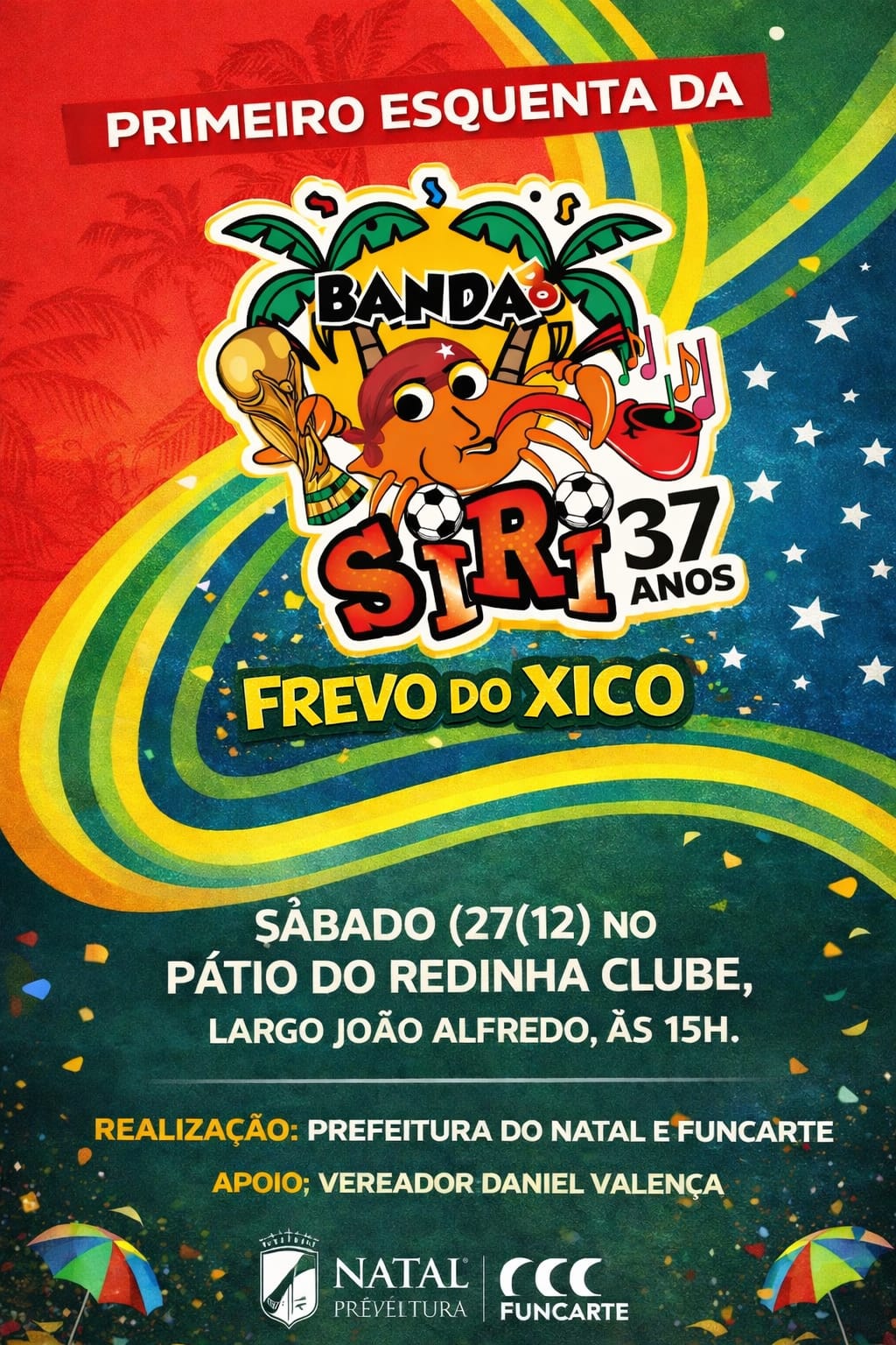 A tradição do arrastão carnavalesco pelas ruas da Redinha ganha mais um capítulo neste sábado (27), com a realização do primeiro esquenta da Banda do Siri. O desfile mantém viva a identidade do bairro, embalado pelo clássico Frevo do Xico, que há décadas anima moradores e visitantes.