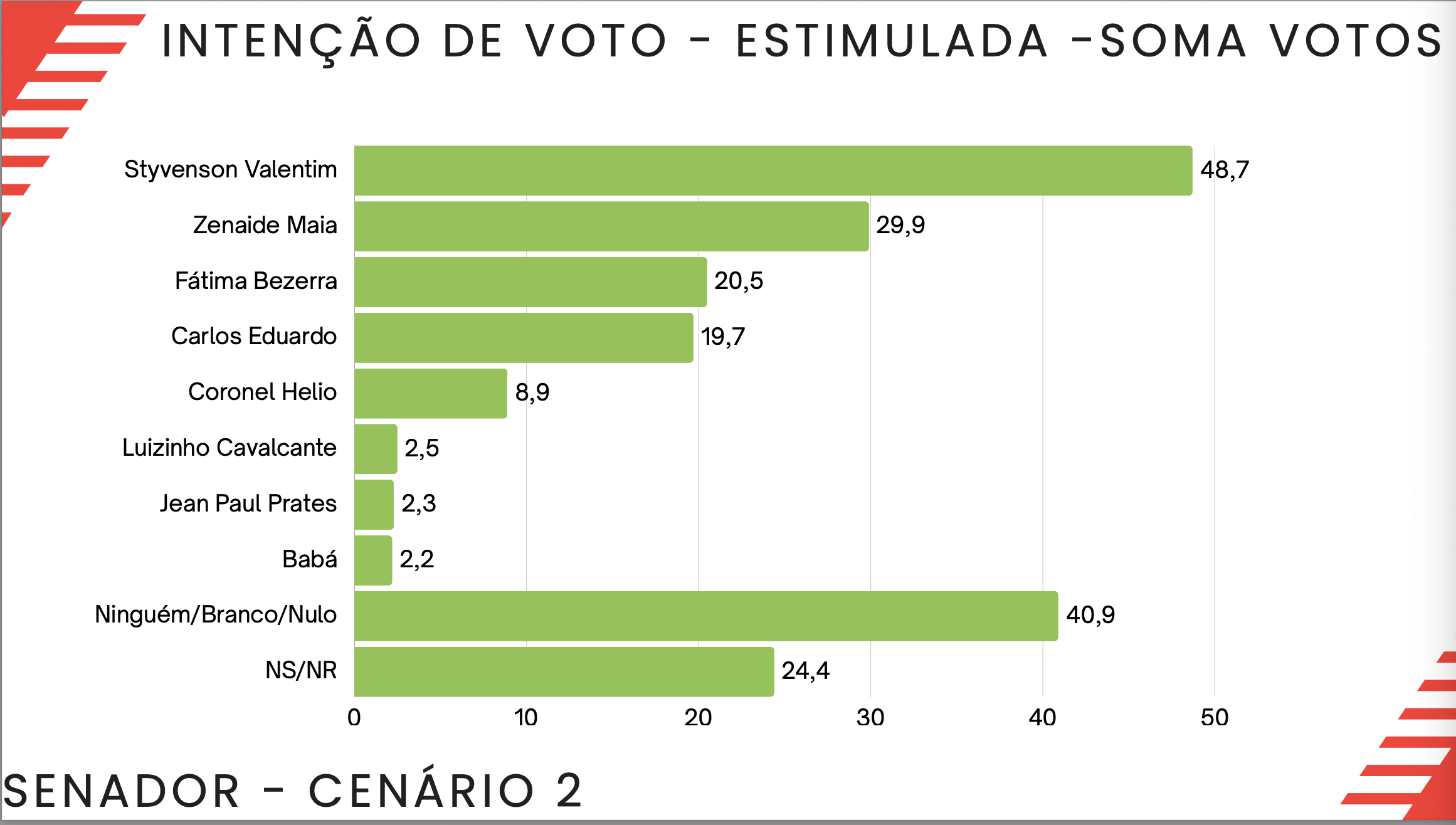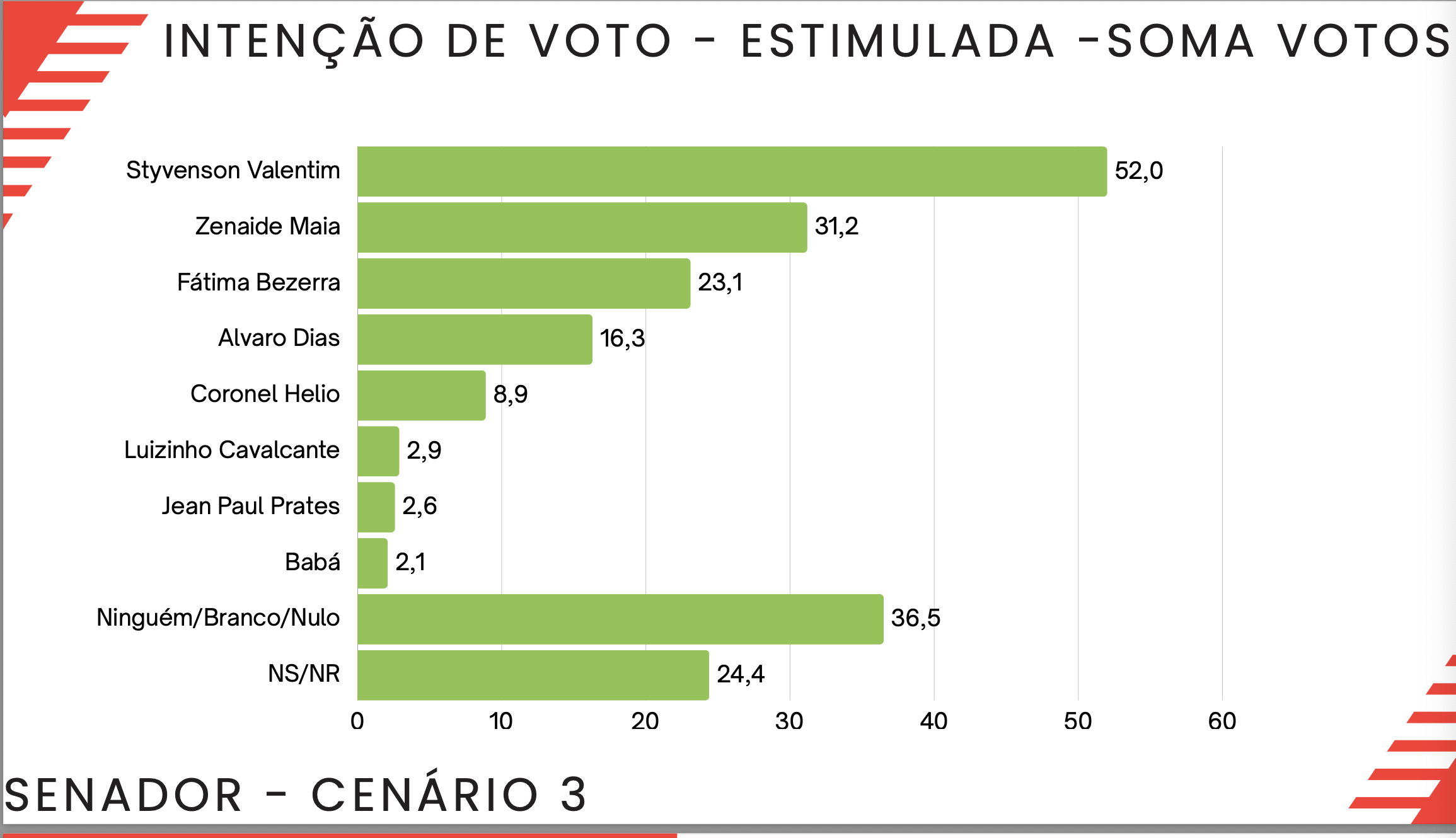 Pesquisa Seta divulgada hoje mostra a disputa para o Senado com a liderança, no cômputo dos dois votos, com a liderança de Styvenson Valentim e em segundo lugar Zenaide Maia. Foram feitos três cenários e em todos eles os dois primeiros lugares permanecem inalterados.